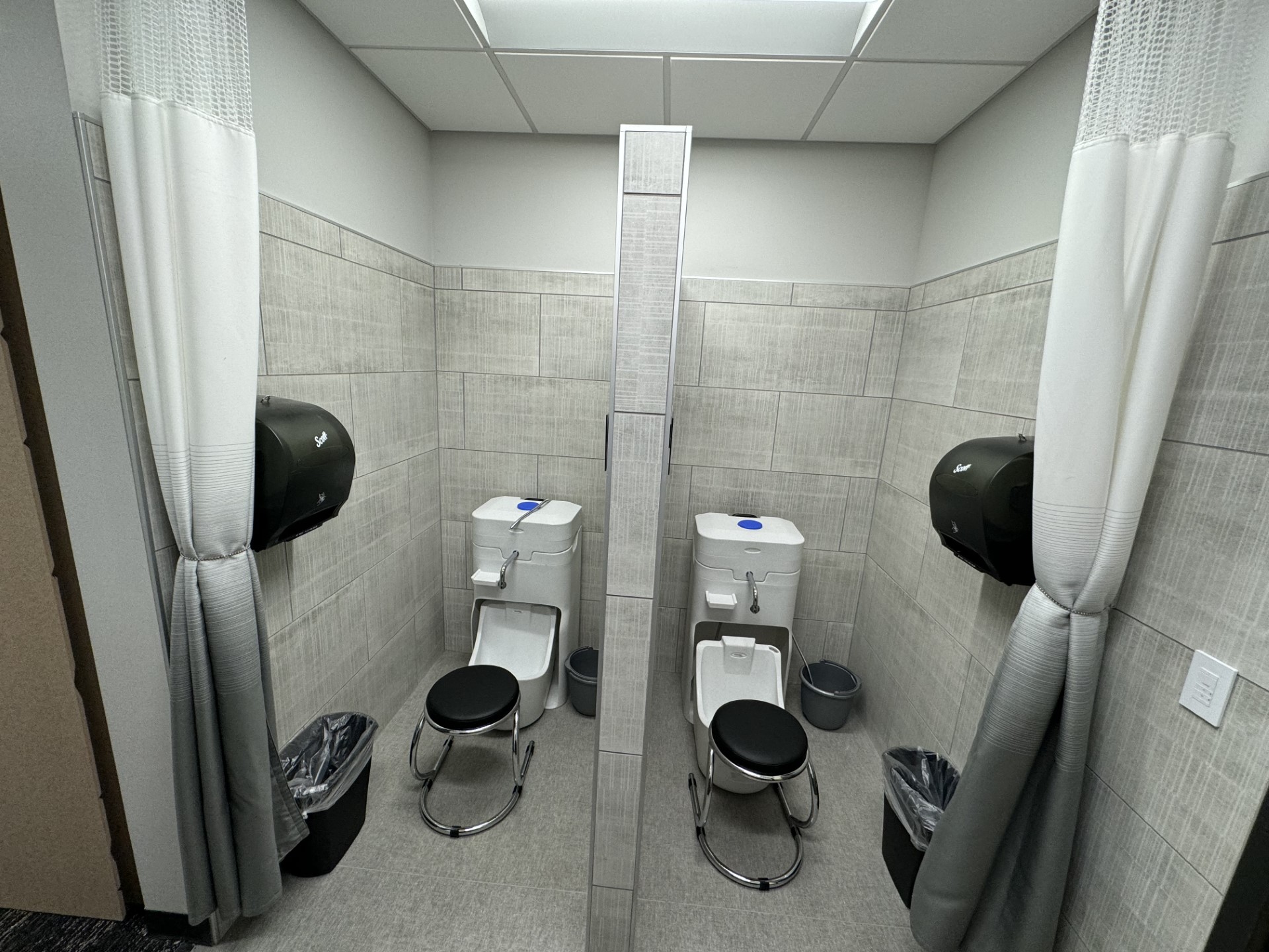 One of them has been positioned at a distance from the others, with a grab bar on the wall, so that it can be more easily used by people with limited mobility.